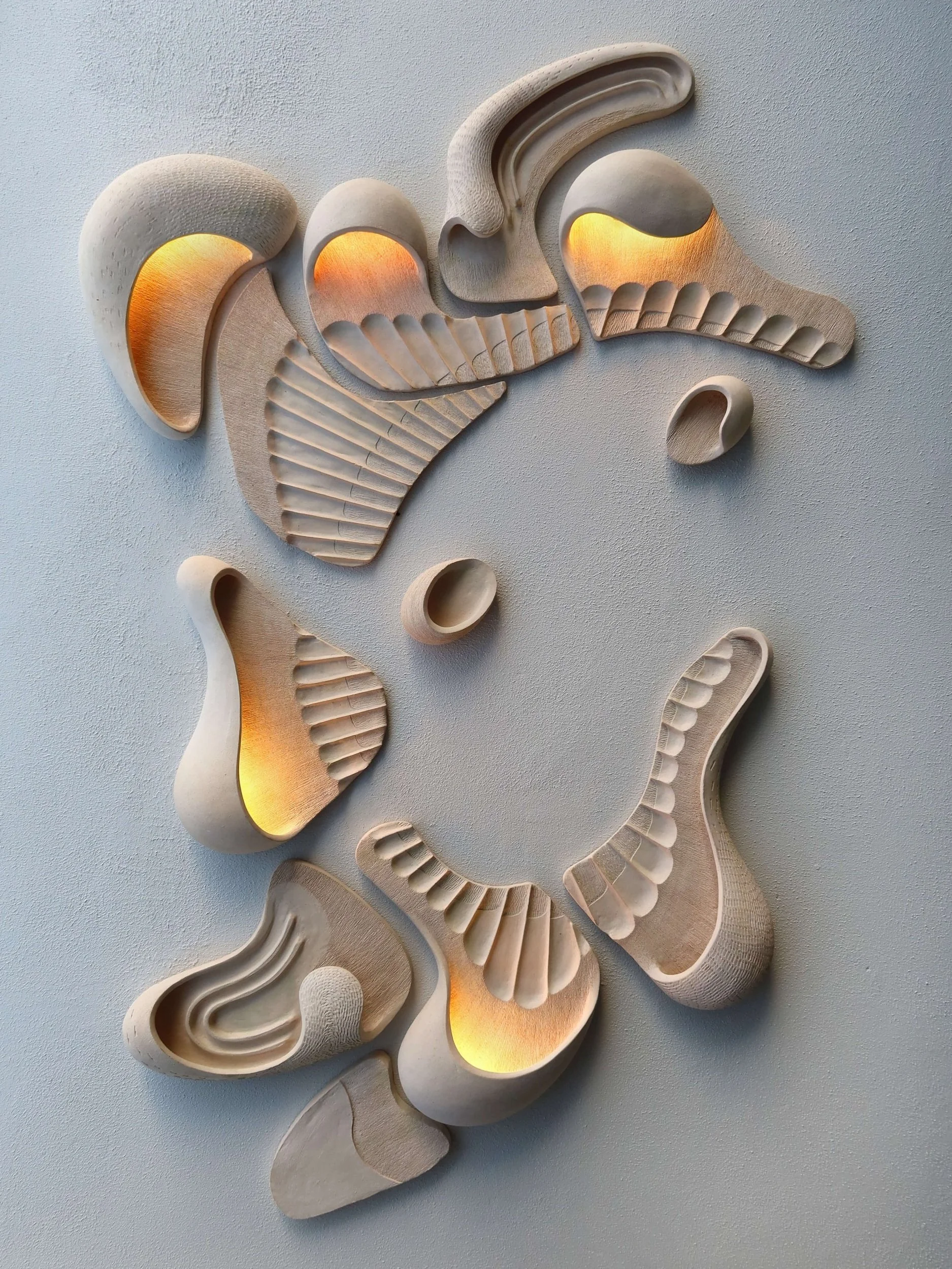 Light also plays a crucial role in shaping form. It defines lines, accentuates curves, or allows edges to dissolve into shadow. In some works, especially wall-mounted lighting pieces, this results in what could be seen as organic wall art, where form and shadow become a unified experience. I’m drawn to light because I see it as an extension of my material palette, not just a byproduct of the object but an integral part of its presence.